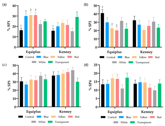 Effects of the color of the straw, extender, and light stimulation on the structure of motile sperm subpopulations in control (nonirradiated) and irradiated samples packed into straws of different color and extended either with Equiplus or Kenney extender. (a) Subpopulation 1 (SP1, which was the fastest subpopulation for VCL, VSL and VAP); (b) Subpopulation 2 (SP2, the slowest); (c) Subpopulation 3 (SP3); (d) Subpopulation 4 (SP4). The different numbers (1, 2) indicate significant differences (p < 0.05) between irradiated and nonirradiated samples packed into different colored straws within the same diluent. The absence of numbers indicates the lack of statistical differences between irradiated and nonirradiated samples packed into different colored straws within the same diluent. On the other hand, no significant differences between nonirradiated and irradiated samples were observed when the two extenders were compared within the same treatment. Data are shown as mean ±SEM of 13 separate experiments.