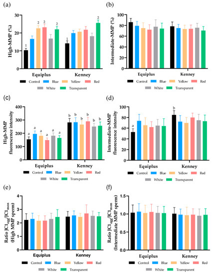 Finally, we also evaluated JC1agg/JC1mon ratios of sperm populations with high (Figure 2e) and intermediate MMP (Figure 2f). No significant differences (p > 0.05) were observed when comparing nonirradiated and irradiated samples, regardless of the color of the straw and extender used, either within the same diluent or when comparing the two extenders.