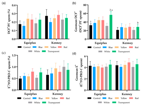 Effects of the color of the straw, extender, and light stimulation on intracellular ROS levels in control (nonirradiated) and irradiated samples packed into straws of different color and extended either with Equiplus or Kenney extender. Data are shown as (a) percentages of viable spermatozoa with high peroxide levels (DCF+/PI−); (b) geometric mean of DCF+-intensity (GMFI, FL1 channel) in the population of viable spermatozoa with high peroxide levels (DCF+/PI−); (c) percentages of viable spermatozoa with high superoxide levels (E+/YO-PRO-1−); (d) geometric mean of E+-intensity (GMFI, FL3 channel) in the population of viable spermatozoa with high superoxide levels (E+/YO-PRO-1−). Different numbers (1, 2) indicate significant differences (p < 0.05) between nonirradiated and irradiated samples packed into straws of different color within the same diluent. Different letters (a, b) indicate significant differences (p < 0.05) between the two extenders within nonirradiated or samples irradiated packed into straws of different color. The absence of numbers or letters indicates the lack of statistical difference between irradiated and nonirradiated samples within the same diluent or when comparing a given treatment between Kenny and Equiplus extenders. Data are shown as mean ± SEM of 13 separate experiments.