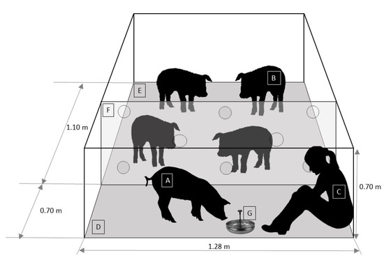 Demonstrator pigs from the DDG and SDG treatments were subjected to a regular GH procedure on days 8–40 of the experimental procedure (Table 1). The GH procedure was performed for 10 min twice a day (between 9:00 to 11:00 h and 14:00 to 16:00 h; 5 days per week) over a period of 5 weeks. The GH session was standardized as follows: (1) 10 min prior to the start of GH, the pen was temporarily partitioned into two areas (demonstrator pig handling area and observer pig area), through the installation of a transparent acrylic panel (1.26 m × 0.7 m) with eight circular perforations (5 cm diameter) homogeneously distributed (Figure 1). Two disguised experimental personnel with white overalls covering their heads and white mask installed the panel from outside the pen. (2) Then, the stockperson entered the observers´ area, calmly caught the demonstrator pig without touching the rest of the animals, and then released it on the floor of the handling area. (3) When the demonstrator pig was in the handling area, the stockperson entered, sat down on the floor, and remained motionless for 3 s. (4) Then, the stockperson held out their hand toward the demonstrator pig. If the demonstrator pig did not move away, the stockperson tried to touch it. Afterwards, if the demonstrator pig accepted being touched, the stockperson started to stroke it gently with the palm of her hand, from head to back for 7 min, at a rate of 1 stroke every 2 s. If the pig was too restless (e.g., climbing on her shoulders or biting her too hard), then the stockperson gently pushed away the demonstrator pig while also avoiding sudden movements. (5) During the next 3 min, the stockperson offered the demonstrator pig a 16% sucrose solution while stroking it. This solution was used based on the study of Figueroa et al. [35], who found that sucrose palatability in pigs was greater at a 16% concentration. The solution was delivered to the stockperson by one of the disguised experimental personnel from outside the pen. In addition to gentle tactile contact, the stockperson spoke to the demonstrator with a soft voice during the GH session. (6) Once the GH was finished, the stockperson picked up the demonstrator pig and returned it to the observer pigs’ area with their penmates and proceeded to leave the pen. (7) Finally, 10 min after returning the demonstrator pig, the two disguised experimental personnel removed the panel and the drinker bowl with the sucrose solution.