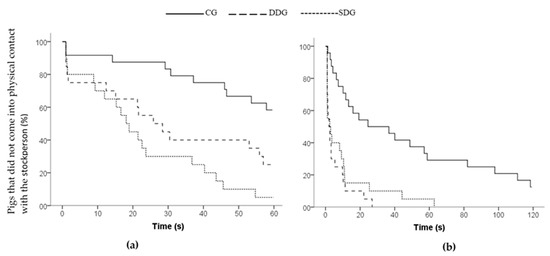 Survivor curve of pigs’ latencies to physical contact with the stockperson during: (a) Phase 2 and (b) Phase 3 of the open-field arena test. Treatments: Control group (CG), Dominant Demonstrator group (DDG) and Subordinate Demonstrator Group (SDG).