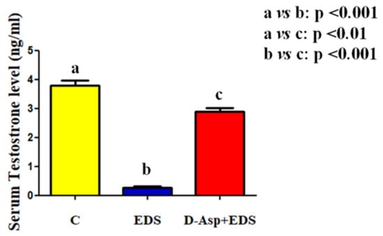In this paper, we evaluated whether the use of D-Asp may have a protective role in preventing the testicular injury produced by the exposure to EDS, a toxicant that selectively destroys LC. Indeed, it must be considered that recently, some pollutants, such as cadmium [41,42,43] and BPA [44,45,46] may act as endocrine disrupters and/or toxicants that specifically affect gametogenesis leading to the production of low-quality gametes and, consequently, giving rise to a low rate of reproduction [47,48]. Firstly, to evaluate the effectiveness of the treatments, we measured the serum T levels. As shown in Figure 1, EDS injection caused a drastic drop in T concentration as compared to the control (p < 0.001), while a less pronounced decrease was evident in the serum of rats pre-treated with D-Asp (p < 0.01).