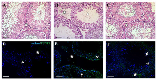 Hematoxylin-eosin and TUNEL staining of rat testicular paraffin-embedded sections. (A–C): Hematoxylin-eosin staining of control (A), EDS (B), and D-Asp + EDS (C) treated rat testes. The absence of Leydig cells in the EDS-treated group is evident; (D,E): Determination of apoptotic cells through the detection of TUNEL-positive cells (green) in control (D), EDS (E), and D-Asp + EDS (F) treated rats. Slides were counterstained with DAPI-fluorescent nuclear staining (blue). The images were captured at ×20 magnification. Scale bars represent 20 μm. Asterisks: Leydig cells. Triangles: luminal Spermatozoa. Arrowheads: Spermatogonia; Striped Arrows: Spermatocytes.