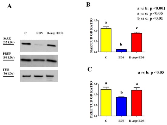 In particular, it was not a surprise to have found a drastic reduction of the StAR level as compared to control (p < 0.001; Figure 3A,B) while, interestingly, concerning PREP, its variation was less pronounced (p < 0.05; Figure 3A,C). This last point could be due probably by the fact that while StAR is specifically expressed by LC, PREP is widely distributed also in the germinal compartment, where its expression was unaffected by EDS, as discussed afterwards. In the rats that received D-Asp, prior the EDS injection, StAR level decrease was less marked (p < 0.01; Figure 3A,B) as compared to that observed in the testis of control animals. Similarly, PREP level in the D-Asp + EDS group was comparable to that of the control. These results support the hypothesis that D-Asp, in a certain manner, may prevent the drastic decrease in the LC number.