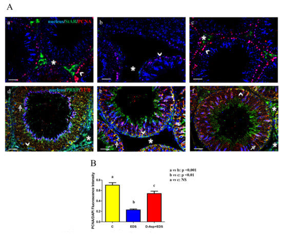 In particular, we observed a specific localization of StAR in the interstitial LC (asterisk, Figure 4A(a)), while it was completely absent in the testis of the EDS-treated group, due to lack of LC (asterisk, Figure 4(Ab)). Moreover, the recovery of the StAR signal in the LC still present in the interstitial compartment of the D-Asp + EDS group was detected (asterisk, Figure 4(Ac)). We performed a labeling for PCNA, a commonly used proliferation marker, whose signal is prominent in those cells which dynamically replicate their DNA, such as spermatogonia (arrowhead, Figure 4(Aa)). Once again, the number of PCNA-positive cells is less accentuated in the EDS-treated animals (arrowhead, Figure 4(Ab)), while in the rat which also received D-Asp, an increased signal of PCNA was observable (Figure 4B). This could be due not only by the putative protective role exerted by D-Asp regarding EDS toxicity, but also by the fact that D-Asp itself is able to induce spermatogonia proliferation, activating MAPK pathway, as previously demonstrated by Santillo and colleagues [19].