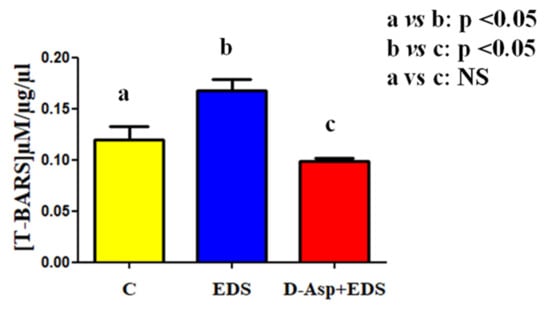 Although, taken together, all these data led us to hypothesize a possible role exerted by D-Asp in preventing EDS toxic action on LC, on the other hand, we had no information concerning the relative mechanism of action. We can speculate that a transesterification reaction between aspartic acid and EDS occurs, in which the corresponding aspartate ester is formed, and the alkylating effect of EDS would be neutralized. Many efforts have been addressed in this direction and among them, one of the most intriguing mechanisms implicated is the oxidative stress induced by EDS treatment. In fact, Zini and Schlegel [49] found that testicular lipid peroxidation significantly increased after EDS injection, together with a decreased catalase and phospholipid hydroperoxide glutathione peroxidase mRNA concentration [49]. In the present study, a similar result was obtained, since in the EDS-treated group, was observed a significant increase of the toxic reactive aldehydes, measured with thiobarbituric acid reactive substances (TBARS) assay (p < 0.05; Figure 5).