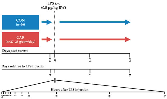 Experimental design. Cows in the control group (CON) as well as cows in the l-carnitine supplemented (CAR) group received an intravenous (i.v.) bolus injection of 0.5 μg/kg body weight (BW) lipopolysaccharides (LPS) on day 111 post-partum. Blood samples were collected until 14 days after LPS injection and frequently at the presented time points.