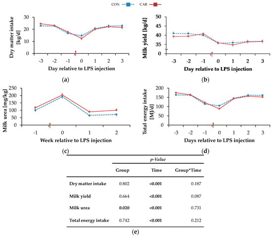 Progression of performance and feed intake data of dairy cows fed a non-supplemented (CON) or an l-carnitine supplemented diet (CAR, 25 g/d from 6 weeks ap up to day 126 pp) before and after an intravenous injection of 0.5 μg/kg BW lipopolysaccharides (LPS) on day 111 pp (red arrow). (a) Daily dry matter intake, (b) daily milk yield, (c) milk urea, (d) daily total energy intake, (e) data statistics. Data are given as LS-Means standard errors. Significant p-values are marked as bold.