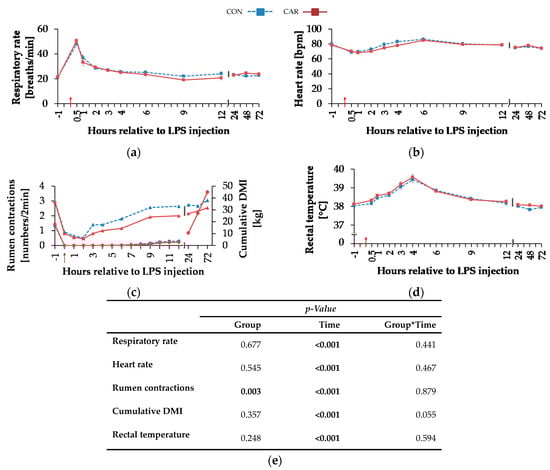 Progression of clinical parameters and cumulative dry matter intake of dairy cows fed a non-supplemented (CON) or an l-carnitine supplemented diet (CAR, 25 g/d from 6 weeks ap up to day 126 pp) before and after an intravenous injection of 0.5 μg/kg BW lipopolysaccharides (LPS) on day 111 pp (red arrow). (a) Respiratory rate (b) heart rate, (c) primary rumen contractions (triangles, left ordinate) and cumulative dry matter intake (DMI) (circles, right ordinate), (d) rectal temperature, (e) data statistics. Data are given as LS-Means standard errors. Significant p-values are marked as bold.