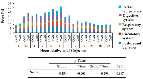 Cumulative clinical score (maximum reachable score: 31 points/100%), consisting of percentages of different categories (posture and behavior, circulatory, respiratory, digestive system and rectal temperature) of cows fed a non-supplemented (CON) or a l-carnitine supplemented diet (CAR, 25 g/d from 6 weeks ap up to day 126 pp) before and after an intravenous injection of 0.5 μg/kg BW lipopolysaccharides (LPS) on day 111 pp. Data are given as LS-Means. 1 Pooled standard error is listed. Significant p-values are marked as bold.