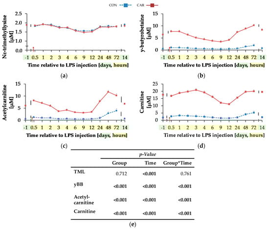 Progression of carnitine metabolites in plasma of dairy cows fed a non-supplemented (CON) or an l-carnitine supplemented diet (CAR, 25 g/d from 6 weeks ap up to day 126 pp) before and after an intravenous injection of 0.5 μg/kg BW lipopolysaccharides (LPS) on day 111 pp (red arrow). (a) Concentration of NƸ–tri-methyl-lysine (TML), (b) y-butyro-betaine (yBB), (c) acetyl-carnitine; (d) free carnitine. (e) Data statistics. Data are given as LS-Means standard errors. Significant p-values are marked as bold.
