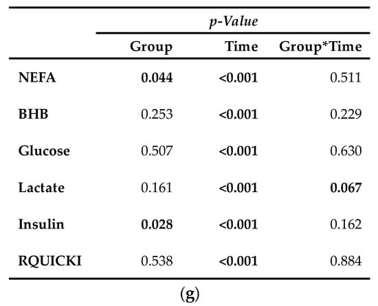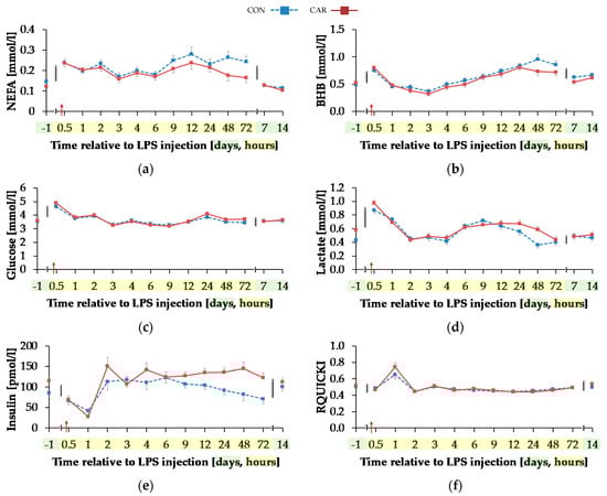 Progression of blood parameters with relevance for energy metabolism of dairy cows fed a non-supplemented (CON) or an l-carnitine supplemented diet (CAR, 25 g/d from 6 weeks ap up to day 126 pp) before and after an intravenous injection of 0.5 μg/kg BW lipopolysaccharides (LPS) on day 111 pp (red arrow). (a) Concentration of non-esterified fatty acids (NEFA) and (b) β-hydroxybutyrate (BHB) in serum, (c) glucose and (d) lactate in whole blood, (e) insulin in serum and (f) Revised Quantitative Insulin Sensitivity Check Index (RQUICKI) = (g) Data statistics. Data are given as LS-Means standard errors. Significant p-Values are marked as bold.