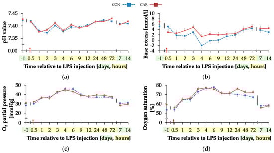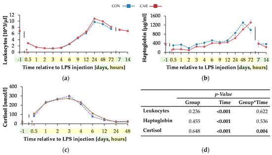 The initial serum haptoglobin concentration (Figure 7b) of 361 ± 92 µg/mL was kept up to 12 h pi. Afterwards, there was an increase to the maximum level of 1312 ± 161 µg/mL at 48 h pi, in CON group which was over three-fold higher than the initial level (pT < 0.001). The CAR group reached the maximum of 1314 ± 128 µg/mL 72 h after LPS injection. At 7 d and d 14 pi the haptoglobin concentration complied the baseline level.