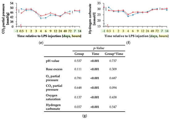 Independently of treatment groups, TpO2 and sO2 (Figure 8c,d) increased by 54%/36% from initial to maximum level of 45.37 ± 1.05 mmHg/76.80 ± 1.34% 4 h pi (pT < 0.001) and returned to initial level after 7 d pi. Also, for TpCO2 (Figure 8e) and total carbon dioxide (Table A5), a time-dependent variation was detected (pT < 0.001). Lowest values occurred 4 h pi (42.05 ± 0.73 mmHg; 25.62 ± 0.58 mmol/L) and both parameters returned to the initial level 48 h pi. For hydrogen carbonate ions (Figure 8f) a time-dependent variation was detected (pT < 0.001). From day 1 ai until 4 h pi minimum value of 24.48 ± 0.56 mmol/L was reached after a decrease by 22%. This increased level remained constant until 48 h pi when it returned to the initial level (pT < 0.001) again.