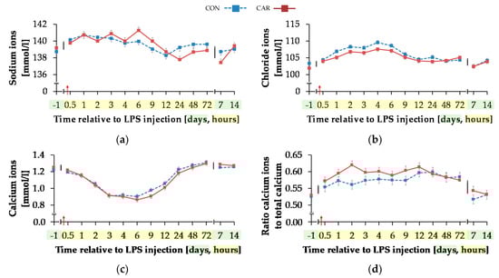 Blood sodium ion concentration (Figure 9a) was differently influenced by l-carnitine supplementation over time (pG*T < 0.001). In CON, the initial level of 138.74 ± 0.46 mmol/L remained unchanged over the whole experiment. In CAR, sodium ions rose by 2% from initial to maximum level of 141.27 ± 0.40 mmol/L at 6 h pi. Thereafter, sodium ion concentration returned to initial level on day 14 pi. Chloride ions (Figure 9b) were 1% smaller in CAR compared to CON on average (pG = 0.037). They reached a maximum level at 4 h pi after an increase by 6% from initial level and returned to it at 12 h pi (pT < 0.001). Irrespective of treatment groups, calcium ions (Figure 9c) dropped by 29% from day 1 ai until 6 h pi to minimum level of 0.88 ± 0.02 mmol/L and returned to initial level until 48 h pi. The total calcium concentration (Table A5) also reached a nadir at 6 h pi but approached the initial level already 24 h pi (pT < 0.001). The ratio of calcium ions to total calcium (Figure 9d) also varied with time irrespective of treatment groups. From day 1 ai until 2 h pi, an increase by 12% was detected. This increase level was kept and a second peak at 12 h pi represented the maximum value (pT < 0.001). A return to initial level did not occur until day 7 pi. Total phosphorus (Figure 9f) declined by 48% from 0.5 h pi until 4 h pi to the lowest level of 0.76 ± 0.05 mmol/L and returned to initial level 9 h pi (pT < 0.001). Independently of l-carnitine supplementation, ratio of total calcium to total phosphorous (Table A5) remained unchanged from day 1 ai until 3 h pi. Then it increased to its maximum level at 4 h pi, which was 48% higher than the initial level. After a decrease, the lowest value was reached 12 h pi and 48 h pi it returned to initial level. Potassium ions (Figure 9e) varied independently of l-carnitine supplementation and decreased by 9% from initial level until 9 h pi to the minimum value of 3.37 ± 0.06 mmol/L (pT < 0.001). At 12 h pi the initial level was reached again (pT < 0.001). Anion gap (Table A5) differed only slightly over time (pT < 0.001). A minimum level of 8.11 ± 0.45 mmol/L was detected 2 h pi but there were no significant deviations from the initial level.