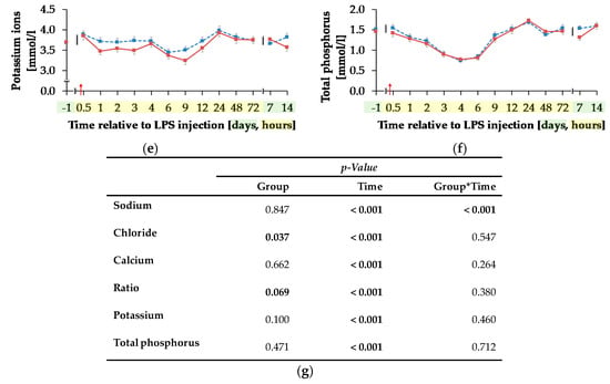 Progression of different electrolytes and total phosphorus in blood of dairy cows fed a non-supplemented (CON) or an l-carnitine supplemented diet (CAR, 25 g/d from 6 weeks ap up to day 126 pp) before and after an intravenous injection of 0.5 μg/kg BW lipopolysaccharides (LPS) on day 111 pp (red arrow). (a) Concentration of sodium ions and (b) chloride ions, (c) calcium ions and (d) the ratio of calcium ions to total calcium, (e) potassium ions and (f) total phosphorus in whole blood. (g) Data statistics. Data are given as LS-Means standard errors Significant p-values are marked as bold.