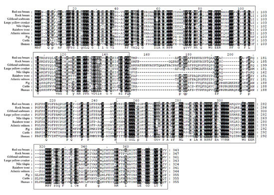 Multiple sequence alignment analysis of the deduced amino acid sequence of PmGal-9 with fish Gal-9 sequences. This analysis is based on the following sequence data: rock bream (ANN46244), gilthead sea bream (XP_030261557), large yellow croaker (XP_010754381), Nile tilapia (XP_003458375), rainbow trout (ACO08221), Atlantic salmon (ACI67584), pig (NP_999097), cattle (NP_001034266), and human (CAB93851). The predicted galactose-binding lectin domains are indicated by the box. Black boxes: identity = 100%; gray boxes: 80% ≤ identity < 100%; light gray boxes: 50% ≤ identity < 80%.