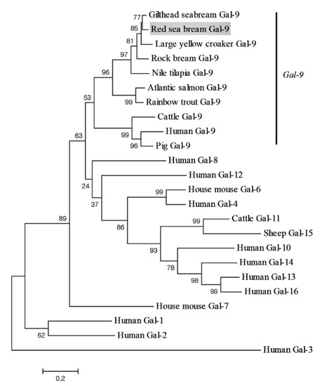 Recently, there has been much interest in the correlation between Gal-9 and tumors in humans, and many studies have reported its role as a prognostic factor [12,15,16]. In teleosts, Gal-9 has been subjected to gene expression profiling and evaluations of its immunological function in a variety of species, but this research is still limited and has not been previously reported in red sea bream [17,18,19,20,21,22].