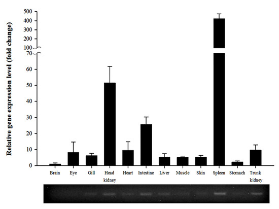 For the analysis of PmGal-9 mRNA transcript levels under healthy conditions, tissues from three independent fish were sampled after euthanasia via benzocaine (Sigma-Aldrich, St. Louis, MI, USA) and stored at −80 °C until total RNA extraction. Total RNA was extracted from the prepared tissues (brain, gills, head kidney, heart, intestine, liver, muscle, skin, spleen, stomach, and trunk kidney) according to the manufacturer’s instructions with RNAiso Plus reagent (Takara, Tokyo, Japan), and genomic DNA was removed. The extracted total RNA was measured for concentration and purity using a NanoVue spectrophotometer (GE Healthcare, London, UK) and synthesized into cDNA using a PrimeScript™ 1st strand cDNA Synthesis Kit (Takara, Tokyo, Japan) according to the manufacturer’s instructions. The PCR products were detected by electrophoresis on ethidium-bromide-stained agarose gels and visualized under ultraviolet light.