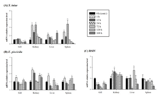Expression level of PmGal-9 mRNA in the gill, kidney, liver, and spleen of red sea bream after infection with (A): Streptococcus iniae, (B): Edwardsiella piscicida, or (C): red sea bream iridovirus (RSIV). Gene expression levels and their significance are represented as the mean ± SD. Asterisks indicate significant differences (* p < 0.05, ** p < 0.01) versus the control group.