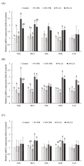 Effects of FL supplementation on mRNA expression levels of the selected genes related to antioxidant-status in (A) liver, (B) jejunum, and (C) ileum of 35-day-old broilers. Values are expressed as the mean ± standard deviation (n = 6). a–c Means among groups without the same letter, within the same sampling day, are significantly different (p < 0.05). WB: Wheat Bran; FL: Laetiporus sulphureus fermented product.