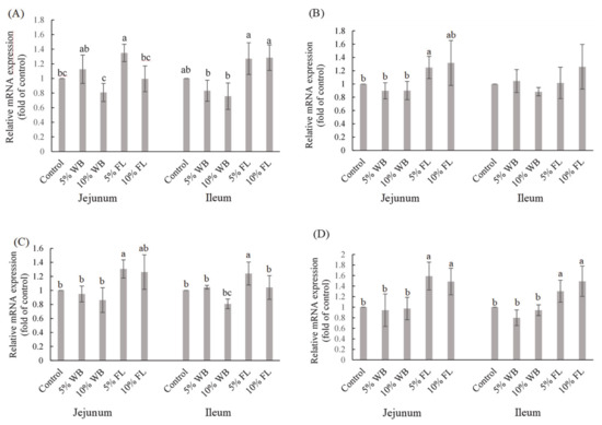 The growth performances of one- to 35-day-old broilers were demonstrated in Table 3 of our previous publication [17]. No significant difference was observed in the body weight, body weight gain, and feed intake of each group of 1–35 day-old broilers and 1–21 day-old broilers (p > 0.05). While 5% FL group had significantly higher BW than the control group and 10% WB group during 22–35 d. The FCR of 5% and 10% FL supplemented groups (both 1.41) were significantly lower than that in the control group (1.47), as well as in the 5% and 10% WB groups (1.45 and 1.46, respectively) (p < 0.05).
