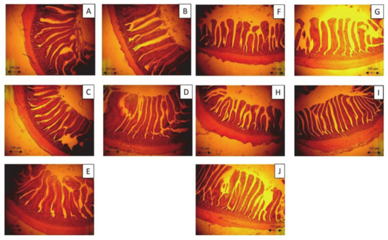 Photomicrography of the jejunum and ileum of 35-day-old broiler fed with control diet and Laetiporus sulphureus fermented product. (A)–(E)—the jejunum of 35-day-old broilers representing the control, 5% WB, 10% WB, 5% FL, and 10% FL groups, respectively. (F)–(J)—the ileum of 35-day-old broilers representing the control, 5% WB, 10% WB, 5% FL, and 10% FL groups, respectively. Haematoxylin and eosin stain (40×).