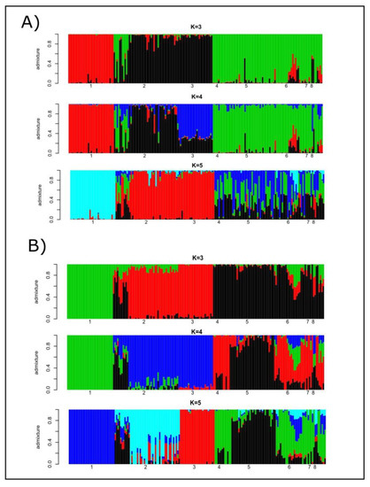Barplots of individual ancestries for K = 3, K = 4 and K = 5 estimated using the program STRUCTURE on microsatellite genotypes (Plot A) and the program ADMIXTURE v1.23 on SNP polymorphism (Plot B). Numbers mean the following: (1) Lagunaire; (2) N’Dama (Burkina Faso); (3) N’Dama (Congo); (4) Zebu Peul (Benin);(5) Zebu Peul (Burkina Faso); (6) Borgou; (7) Lobi; and (8) Zou. Populations from 1 to 3 belong to West African taurine cattle, populations 4 and 6 belong to West African zebu cattle, and populations from 6 to 8 belong to sanga cattle.