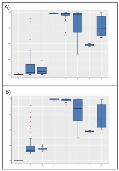 Boxplots illustrating the variation of individual admixture coefficient, q, estimated using microsatellites (Plot A) and SNPs (Plot B), by cattle population assuming K = 2. The box represents the range that contains the values within the limits of the standard error of the mean, the line within the box indicating the mean value. The whiskers are the lines that extend from the box to the standard deviation excluding outliers. Outliers, which are represented by red dots, are values that are 1.5–3 standard error lengths from the upper or lower edge of the box. Numbers on the X-axis mean the following: (1) Lagunaire; (2) N’Dama (Burkina Faso); (3) N’Dama (Congo); (4) Zebu Peul (Benin); (5) Zebu Peul (Burkina Faso); (6) Borgou; (7) Lobi; and (8) Zou. Populations from 1 to 3 belong to West African taurine cattle, populations 4 and 6 belong to West African zebu cattle, and populations from 6 to 8 belong to sanga cattle.