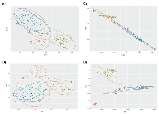 Using microsatellites, PCA allowed us to identify 39 factors with an eigenvalue higher than 1 explaining 79% of the genetic variability. In total, the three first factors explained 44% of variability (32%, 8.3%, and 3.7%, respectively). Using SNPs, PCA allowed us to identify eight factors with an eigenvalue higher than 1, explaining 21% of the genetic variability. The three first factors identified explained 17% of variability (11%, 4%, and 2%, respectively). In general, PCA confirmed the general scenario depicted by genetic structure analyses. However, microsatellites (Figure 3A,B) gave a lower differentiation among populations with clear overlap between confidence intervals for the dispersion of the individuals assigned to each population. This was particularly true for the zebu and sanga cattle populations. Within taurine cattle, Lagunaire individuals tended to be separated. SNP-based PCA (Figure 3C,D) gave clearer separation of the taurine cattle from the zebu and sanga cattle. Furthermore, the confidence intervals computed separated the two N’Dama populations sampled. In any case, the figure constructed using the two more informative factors computed on SNPs (Plot 3C) suggested the existence of “continuous” genomic variation between taurine and zebu West African cattle.
