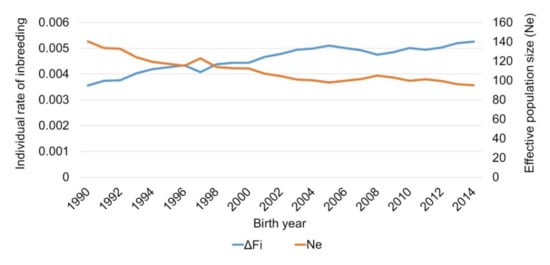 The same trend was seen for the individual rate of inbreeding per generation with an increase from 0.0036 to 0.0053 from 1990 to 2014. A slight decrease in the individual rate of inbreeding per generation was obvious in 1997, 2006–2008 and in 2011. The effective population size decreased inversely to the individual rate of inbreeding per generation from 141 in 1990 to 95 in 2014 (Figure 2).