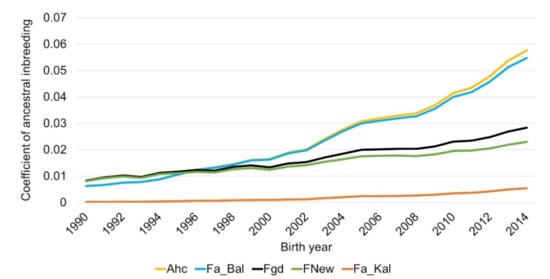 All ancestral coefficients of inbreeding showed an increasing trend over time. The highest increase was determined for Ahc and Fa_Bal, which reached nearly 0.06 in 2014, whereas Fgd reached 0.028 in 2014. Compared to Fgd, a lower increase was found in FNew and Fa_Kal, whereas the level of FNew was higher compared to Fa_Kal (Figure 3).