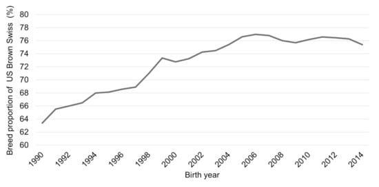 The breed proportions of US Brown Swiss raised from 63% in 1990 to 77% in 2006, whereas from 2007 on, a slight declining tendency to 2014 to 75% was seen (Figure 4). Using a broken line model with the procedure NLIN of SAS, version 9.4 (Statistical Analysis System, Cary, NC, USA, 2020), the yearly increase was 0.8393 to 76.71% of breed proportions of US Brown Swiss in 2006 and from there a yearly decrease by −0.0923 to 75.9% breed proportions of US Brown Swiss.