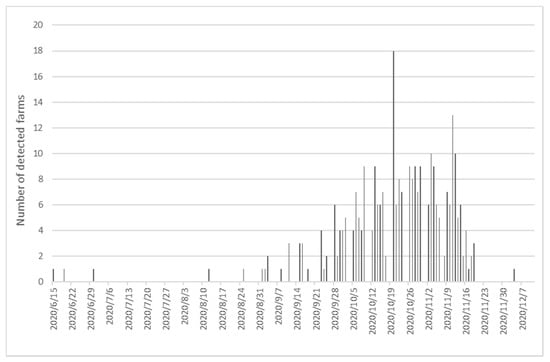 After this phase, the epidemic went into a “silent phase”, from 4 July to 11 of August (Figure 1), where no SARS-CoV-2 infected mink were identified. During this period, a surveillance system for SARS-CoV-2 in mink was put in place, including surveillance of dead mink from all Danish mink farms every third week. Furthermore, a system was set up to survey if persons living at the same address as a registered mink farm had tested positive for SARS-CoV-2. People living on mink farms or with any other connection to mink farms were encouraged to be tested on a weekly basis. Moreover, a new regulation was put in place, which did not include culling of infected farms, but provided obligations to implement a biosecurity plan at all mink farms (positive and negative), including use of personal protective equipment while working within the animal area. On August 12, the first farm in the second phase of the epidemic was detected. This farm was also located in Northern Jutland. The suspicion was raised, based on a positive SARS-CoV-2 diagnostic result originating from the surveillance of dead mink. As a result of the new regulations, mink at this farm, and those detected subsequently, until October 8, were not culled. In the period up to September 28, the virus was detected on 30 additional farms, all located in the original two counties in Northern Jutland. From September 29, detection of infected farms occurred in neighboring counties and from October 6 more widely in Jutland. On 2 October, when 43 farms were detected positive and another 26 were under suspicion of SARS-CoV-2, it was decided to cull mink on all SARS-CoV-2 positive farms and in zones of 7.8 km around the infected farms, as laid down in Ministerial Order No. 1455 of 8 October 2020 [25]. Despite these measures, new outbreaks still occurred over the next month, and by November 4, 207 farms were tested positive and 23 farms were under suspicion; these farms were geographically spread over 20 counties in Jutland (Supplementary file, Figure S1. At this time, the Danish prime minster announced that all Danish mink, including breeding stock, should be culled and that no re-introduction of mink would be allowed before the end of 2021.