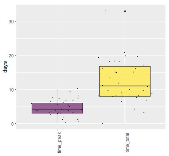 Days from when first clinical signs of SARS-CoV-2 in mink were observed to the observed peak of infection (left) or to when the last clinical signs (right) were observed by the farmer. The thick line illustrates the median, 50% of the observations are within the box, whiskers illustrates the largest value no further than 1.5 inter-quartile range from the box, and dots beyond the whiskers illustrate outliers. The small dots (jitters) within the box and whiskers indicate the observations (one for each farm).