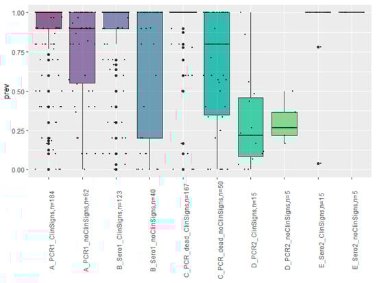 Anti-SARS-CoV-2 seroprevalence (B,E) and virus prevalence (PCR, A, C, D) in Danish mink farms in the period from 15 June to 12 November 2020, at first and second sampling dates (A, B, D, E) and virus prevalence in dead mink (C). All dead mink were from the first sampling date. Farms are divided in farms where clinical signs were observed (ClinSigns), and farms without observations of clinical signs (noClinSigns). The number of farms included in each type of sampling is indicated as n. Most often, samples from 10 live mink were taken from each farm, but with some variation (1–30 samples), as well as samples from 5 to 10 dead mink. The thick line illustrates the median, 50% of the observations are within the box, whiskers show the largest values no further than 1.5 inter-quartile range from the box, and dots beyond the whiskers indicate outliers. The small dots (jitters) within the box and whiskers illustrate the observations (one for each farm).