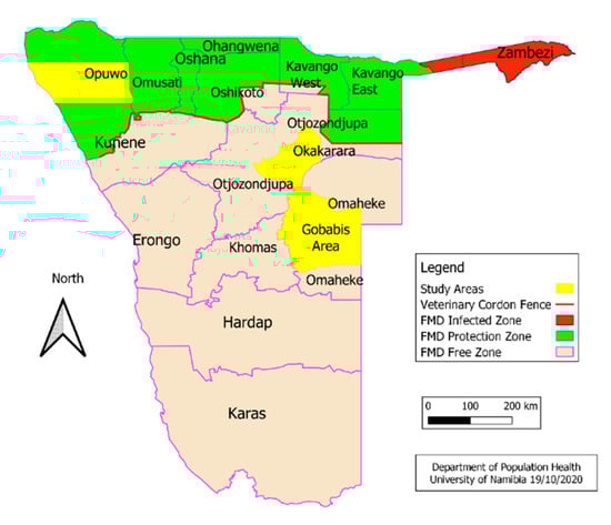 Namibian beef farming is dependent on extensive grazing under semi-arid, rain-fed conditions [1,2]. The beef cattle industry is predominantly driven by the demarcation of Namibia into two parts (northern and southern) by the veterinary cordon fence (VCF; see Figure 1). The VCF is an important biosecurity measure for animal disease control, particularly for contagious bovine pleuropneumonia and foot and mouth disease (FMD). North of the VCF, livestock and livestock products are not eligible for overseas export because of the risk of FMD which is endemic in north-east Namibia [3,4]. All farming rangeland north of the VCF is allocated to communal farmers with customary tenure [5,6]. Most households in these areas are subsistence-based and labor intensive, with inadequate access to technology [6].