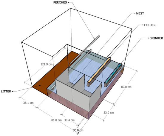 The rooms were laid out to meet the CFS housing requirements stipulated in the Code of practice for the care and handling of pullets and laying hens of the National Farm Animal Care Council of Canada (NFACC) [3]. Hens had free access to a wire floor space (122 cm long, 81 cm wide, and 30 cm high) and a litter space at floor level (122 cm length and 38 cm wide) (Figure 1). At the beginning of each experiment, the litter space was covered with a 5 cm thick wood shaving bedding. The wire floor was made with a square mesh wire cloth, and it was equipped with two nest boxes (30 cm by 33 cm) delimited by black plastic curtains and lined with a washable plastic mesh. The animal density was one hen per 1115 cm2. Two nipple drinkers and a linear feeder were installed in the wire floor space. The bird droppings collected beneath the wire floor were dried with forced air and removed once a week. A perforated 7.5 cm diameter duct blew air from a 10 cm blower (VTX-400, Atmosphere, Terrebonne, Quebec, Canada) fixed beneath the air inlet. Several holes (diameter: 5 mm, 160 mm apart), were positioned at a 45° angle. Then, based on airflow of 0.7 m3 h−1 hen−1, the blower was adjusted to obtain an air velocity of 2 m s−1. Two PVC-pipes (round profile) were installed over the wire floor area of each room (5 cm and 45 cm high), resulting in a linear space of 20 cm per hen.