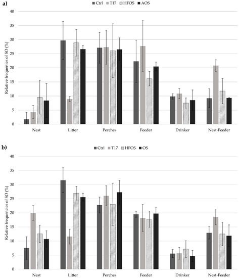 The relative frequencies (%) of SO for the first and second batches are shown in Figure 3a,b. In the case of the first batch, values from the HFOS and AOS treatments have similar frequencies for all the six regions when compared to the control, except for nest area where larger values of 9.6% and 8.4% were calculated (Figure 3a). As mentioned before, it is noteworthy that frequency values in nest area were calculated by approximative subtraction since there was not any camera available inside the nest boxes. Low use of litter was observed in the T17 treatment, with a relative frequency of 8.9% ± 0.8%, compared to 26%–29% observed in the other treatments and the control. The odds of animal presence in the litter area were 3.45 times higher in control than that of the T17 treatment (p = 0.0001). It was observed that occupancy in feeders and nest-feeders area for the T17 treatment showed higher relative frequencies, with percentages of 27.8% ± 9.0% and 20.8% ± 2.0%, compare to 16%–22% and 9%–11% observed in the other treatments and the control, respectively. In fact, hens preferred the feeder area 1.69 times more in T17 when compared to the HFOS treatment (p = 0.04). Furthermore, the odds of occupancy in nest-feeders were 1.74 and 2.24 times higher in T17 treatment than that in the HFOS treatment (p = 0.05) and control (p = 0.0078).