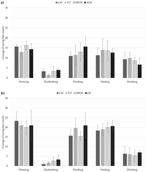 Average counts of laying hens displaying the five natural behaviors with standard deviations. (a): Batch 1; (b): Batch 2. Ctrl = traditional aviary system. T17 = decrease of litter surface area. HFOS = use of heated floor with oil sprinkling periods. AOS = use of biochar material with oil sprinkling periods. OS = oil sprinkling periods.