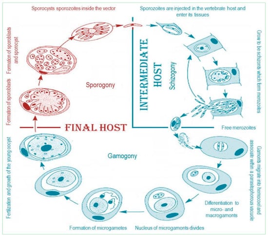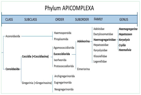 Phylum Apicomplexa was described by Levine [1] to include parasitic protozoa sharing unique ultrastructural features known as the “apical complex” (Figure 1). Haemogregarines (Figure 2) are ubiquitous adeleorine apicomplexan protists inhabiting the blood cells of a variety of ectothermic and some endothermic vertebrates [2,3,4]. They have also an obligatory heteroxenous life cycle (Figure 3), where asexual multiplication occurs in the vertebrate host; while sexual reproduction occurs in the hematophagous invertebrate vector [5]. This family contains four genera, according to Levine [6]: Haemogregarina Danilewsky [7], Karyolysus Labbé [8], Hepatozoon Miller [9], and Cyrilia Lainson [10]. Barta [11] conducted a phylogenetic analysis of representative genera in phylum Apicomplexa using biological and morphological features to infer evolutionary relationships in this phylum among the widely recognized groups. The data showed that the biologically diverse Haemogregarinidae family should be divided into at least three families (as suggested by Mohammed and Mansour [12]), were family Haemogregarinidae, containing the genera Haemogregarina and Cyrilia; family Karyolysidae Wenyon [13], of the genus Karyolysus; and family Hepatozoidae Wenyon [13], of the genus Hepatozoon, since the four genera currently in the family do not constitute a monophyletic group. The picture is further complicated by evidence from a study by Petit et al. [14] of a new Brazilian toad haemogregarine parasite Haemolivia stellata.