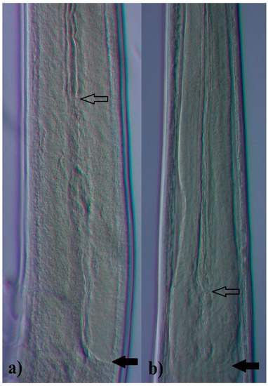 Esophageal-intestinal (EI) valve of (a) Ostertagia leptospicularis from roe deer (Capreolus capreolus), (b) Ostertagia ostertagi from cattle (Bos taurus; arrows at anterior and posterior end; magnification 600×).