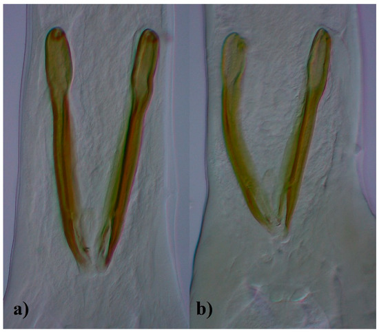 Spicules of Ostertagia leptospicularis from (a) roe deer (Capreolus capreolus), (b) cattle (Bos taurus) ventral view (magnification 400×).