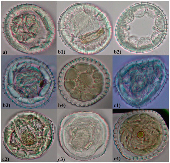 Longitudinal cuticular ridges of Ostertagia leptospicularis males shown in transverse sections (a) at the esophageal-intestinal (EI) valves, n = 36, host roe deer (Capreolus capreolus); (b1–4) at the midbody: (b1) n = 31, cattle (Bos taurus); (b2) n = 32, cattle; (b3) n = 35, red deer (Cervus elaphus); (b4) n = 36, roe deer; (c1–4) above the anterior end of the spicules: (c1) n = 30, red deer; (c2) n = 31, cattle; (c3) n = 32, roe deer; (c4) n = 34, roe deer (magnification 600×).
