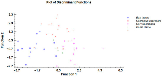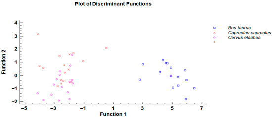 Using a forward stepwise selection algorithm, it was determined that four variables were significant predictors of host species (total body length, intestinal valve length and width, left spicule length). Both canonical discriminant functions had small values of Wilks’ lambda (0.126165 and 0.4477, respectively) and were significant (Chi-squared approximation, p < 0.0001). As illustrated in Figure 4, the first function separated specimens from cattle and cervid host species, and the second function differentiated specimens from principal host (i.e., roe deer) and other host species.