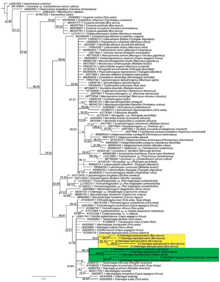 - Zarlenga, D.S.; Hoberg, E.P.; Stringfellow, F.; Lichtenfels, J.R. Comparison of two polymorphic species of Ostertagia and phylogenetic relationships within the Ostertagiinae (Nematoda: Trichostrongyloidea) inferred from ribosomal DNA repeat and mitochrondrial DNA sequences. J. Parasitol. 1998, 84, 806–812. [Google Scholar] [CrossRef]