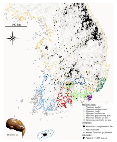 To assess the patry status of each individual—here defined as sympatric or allopatric—independently of the presence of samples from the location belonging to two clades, we reconstructed the range of each species. To do so, we used all datapoints with molecular identification available from the literature [42,52,53,54,55,57]. However, some datapoints were not precise enough to be used for range reconstruction, and we only used datapoint with at least 2 km accuracy, resulting in a sample size such as: H. leechii = 107; H. quelpaertensis = 31; H. unisacculus = 5; H. yangi = 29; H. notialis sp. nov. = 10; H. geojeensis sp. nov. = 2 and H. perplicatus sp. nov. = 2. We did not use alternative data, such as data originating from citizen science, as it has been noted to be unreliable for newly described taxa for our focal species [59]. However, we downloaded datapoints from GBIF.org to populate range maps with presence points (doi:10.15468/dl.rxx5kn; Figure 1).