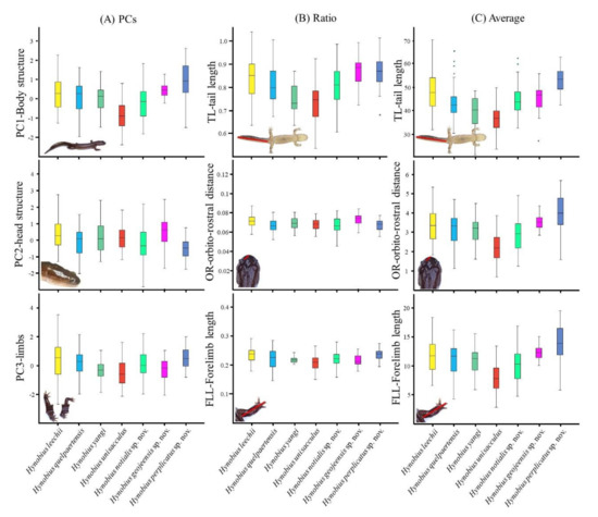 As body size of small vertebrates is known to be affected by climate [65], and some of the measurements collected here were relatively old and potentially impacted by climate change, we decided to use a ratio to correct for body size in relation with individual growth, in line with the general literature on morphological analyses [10]. This decision was made in agreement with earlier publication comparing the use of ratios to correct for isometric growth between individuals of different age classes [66,67], and because not all individuals collected were from the same age and sex, and vouchers are therefore expected to display more variation than a single age class (e.g., breeding males; [68]). To create the ratio, we did not divide the data by the total body length (SVL + TL) because of missing data for TL (n = 36), but by SVL only.