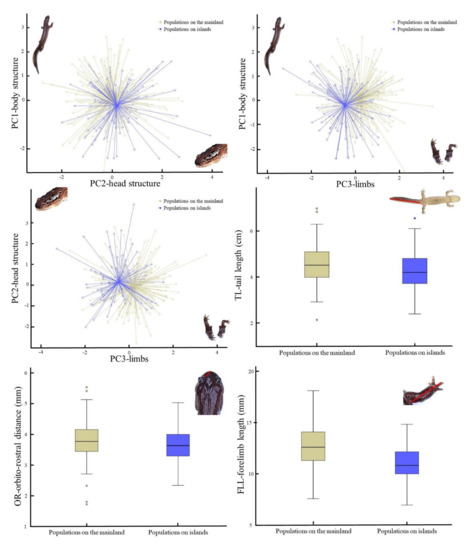 The results of the analysis to determine the impact of the island effect on the morphology of Hynobius spp. through the GLMM resulted in a statistically supported model (Omnibus test; χ2 = 25.33, df = 4, p < 0.001) when comparing the fitted model against the intercept-only model. Within the predictive variables, PC1, PC2 and PC3 were significant (Table 6). The graphs plotting the PCs against one another in relation to presence on islands or on the mainland show a clear segregation of centroids (Figure 3). Accordingly, the box plots for the variables loading the most importantly into each of the significant PCs showed a difference as well, with populations on the mainland being larger than those on islands (Figure 3; Table 5).