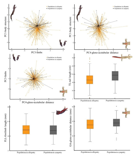 The results of the analysis to determine the impact of sympatry on the morphology of Hynobius spp. through the GLMM resulted in a statistically supported model (Omnibus test; χ2 = 14.67, df = 4, p = 0.003) when comparing the fitted model against the intercept-only model. Among the predictive variables, PC1, PC3 and PC4 were significant (Table 7), with non-overlapping centroids when plotting the PCs against another (Figure 4). In terms of morphology for the variables loading the most importantly into each PC, individuals in sympatric populations showed higher values than those from populations in allopatry for tail length and gleno–acetabular region, but populations in allopatry had longer forelimb length (Figure 4; Table 5).